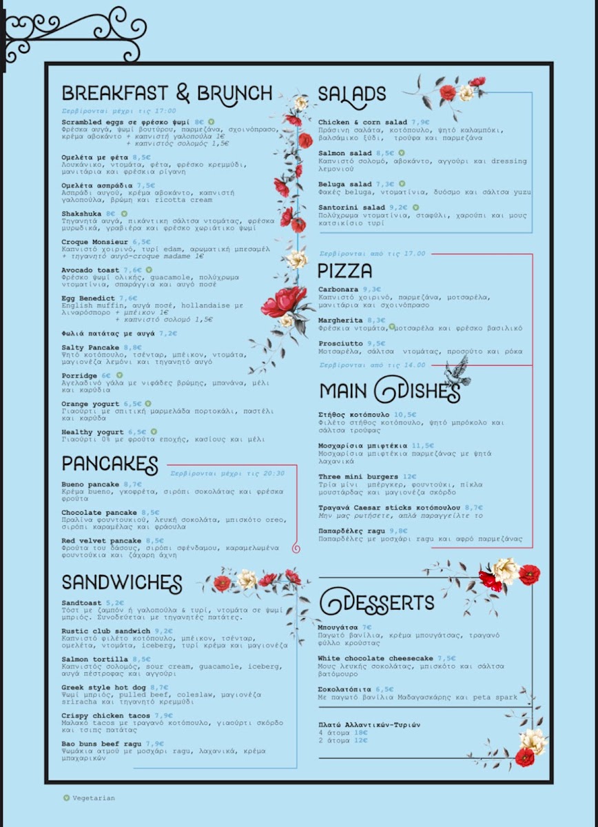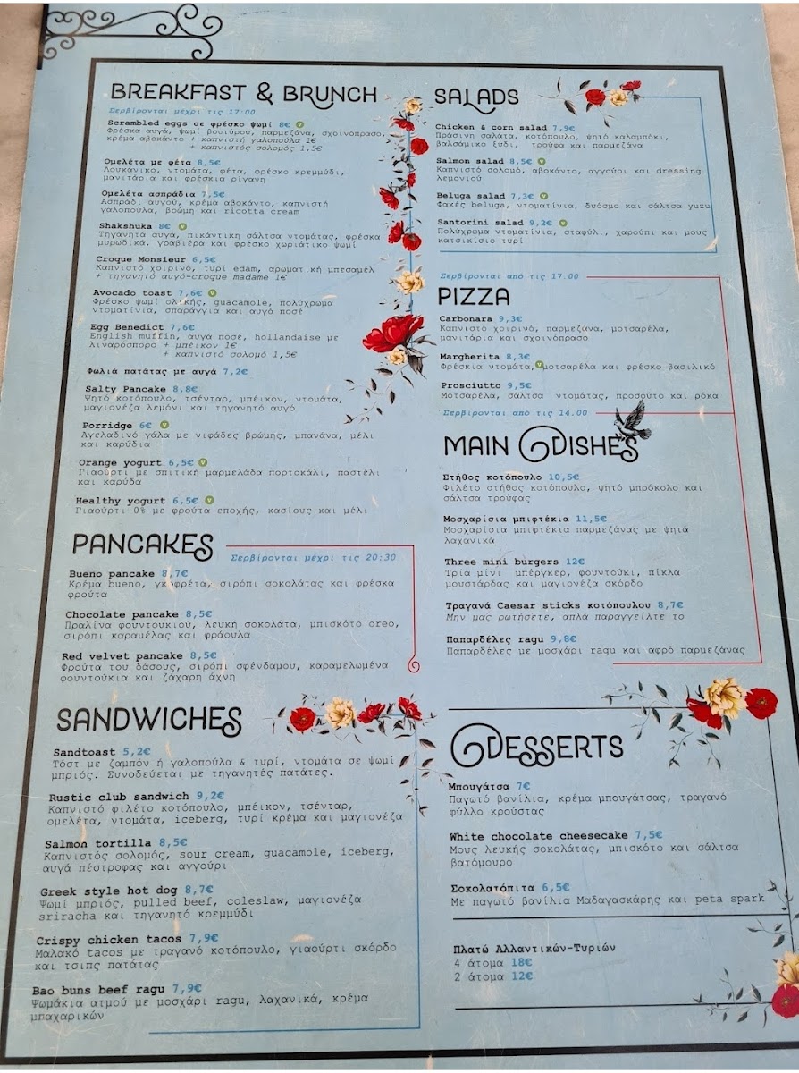 The breakfast and brunch options feature familiar, satisfying dishes like fluffy scrambled eggs served on fresh bread with avocado cream, or a hearty omelette accented by local feta and herbs—perfect for those looking to start the day with something simple yet flavorful. Pancakes here bring a sweet balance to the menu, with choices like chocolate praline or red velvet topped with fresh fruits and delicate syrups that complement the peaceful outdoor setting.